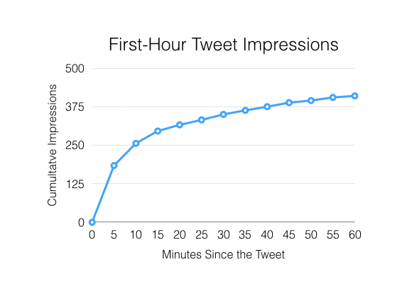 Going to analytics.twitter.com, I tracked the growth in impressions for this tweet in 5-minute intervals for the first hour. Here’s the graph: