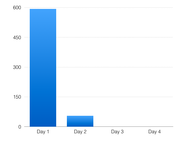 Within the first hour the tweet had 410 impressions. As the slope of the line indicates, it was slowing down significantly. Here’s the graph of total impressions each day for the first two days: